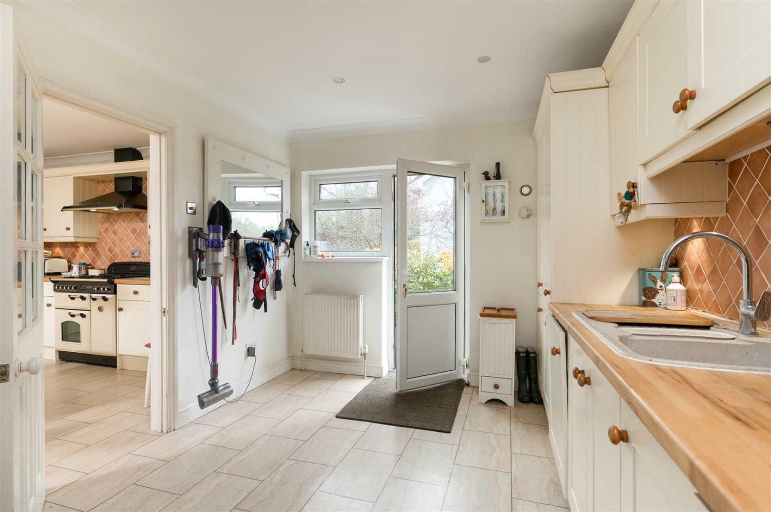 The front door opens to an entrance vestibule, which in turn leads to a spacious hallway with a contemporary staircase ascending to the first floor with a glass balustrade that returns to for a galleried landing. There is a cloakroom and doorways lead to the spacious and well presented living accommodation. There are generous windows throughout enjoying the vista of the beautiful walled gardens. The kitchen breakfast room is well appointed, and leads to a very large utility/laundry room.